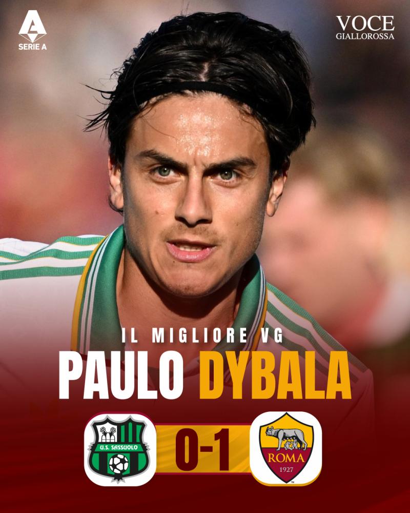 La Roma vince in casa del Sassuolo e si riprende il primo posto in classifica. I giallorossi hanno espugnato il campo dei neroverdi grazie a un altro gol di Dybala, dopo quello contro il Viktoria Plzen. L'argentino è stato così eletto ancora come #IlMiglioreVG del match attraverso i canali social di Vocegiallorossa.it: X, Instagram, Facebook e Threads. Per Dybala si tratta del secondo riconoscimento stagionale.