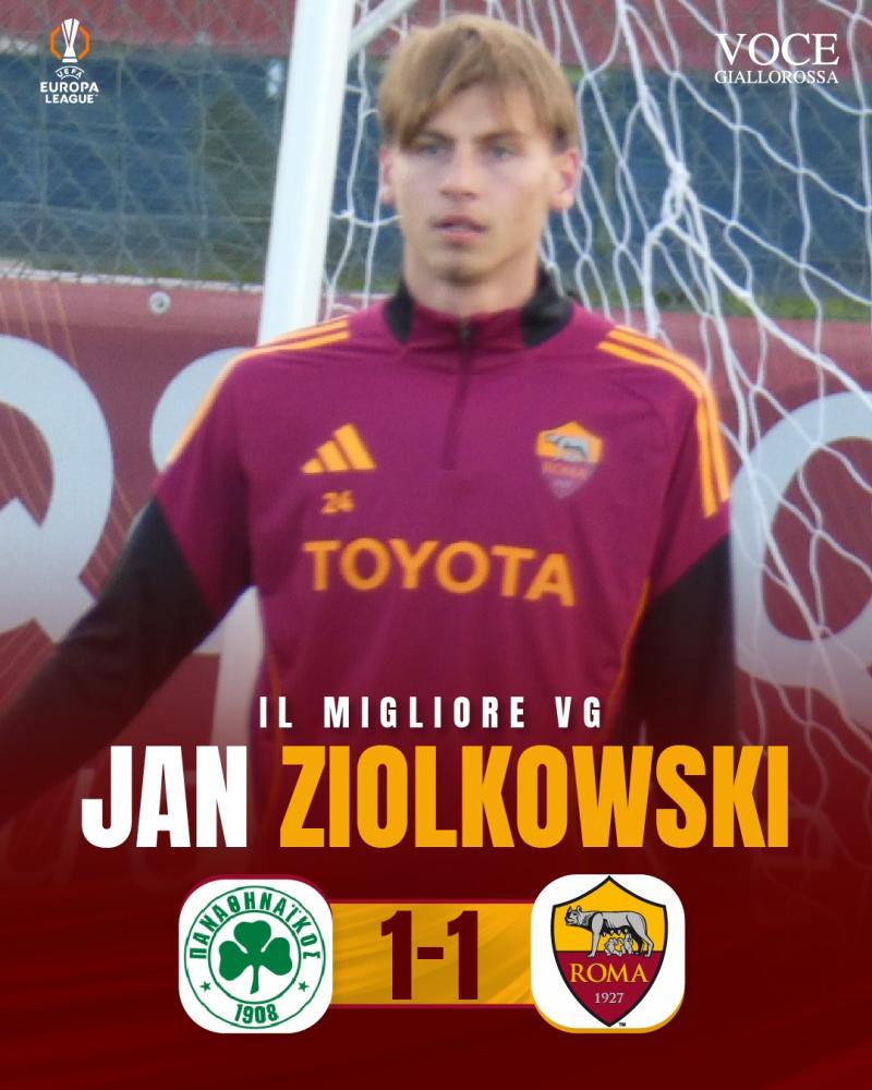 La Roma, dopo il primo pareggio stagionale contro il Milan, ottiene un altro pareggio in Europa League contro il Panathinaikos, importantissimo ai fini della classifica dato che permette ai capitolini di qualificarsi agli ottavi di finale della competizione senza passare dal purgatorio dei playoff. I giallorossi hanno sofferto per tutta la partita, soprattutto dopo l'espulsione di Mancini nei primi minuti di gara. La Roma è andata sotto a inizio secondo tempo per poi recuperare il risultato nel finale di partita grazie al gol di Jan Ziolkowski. Proprio il giovane difensore giallorosso è stato nominato #IlMiglioreVG dai nostri lettori attraverso le votazioni avvenute sui canali social di Vocegiallorossa.it.