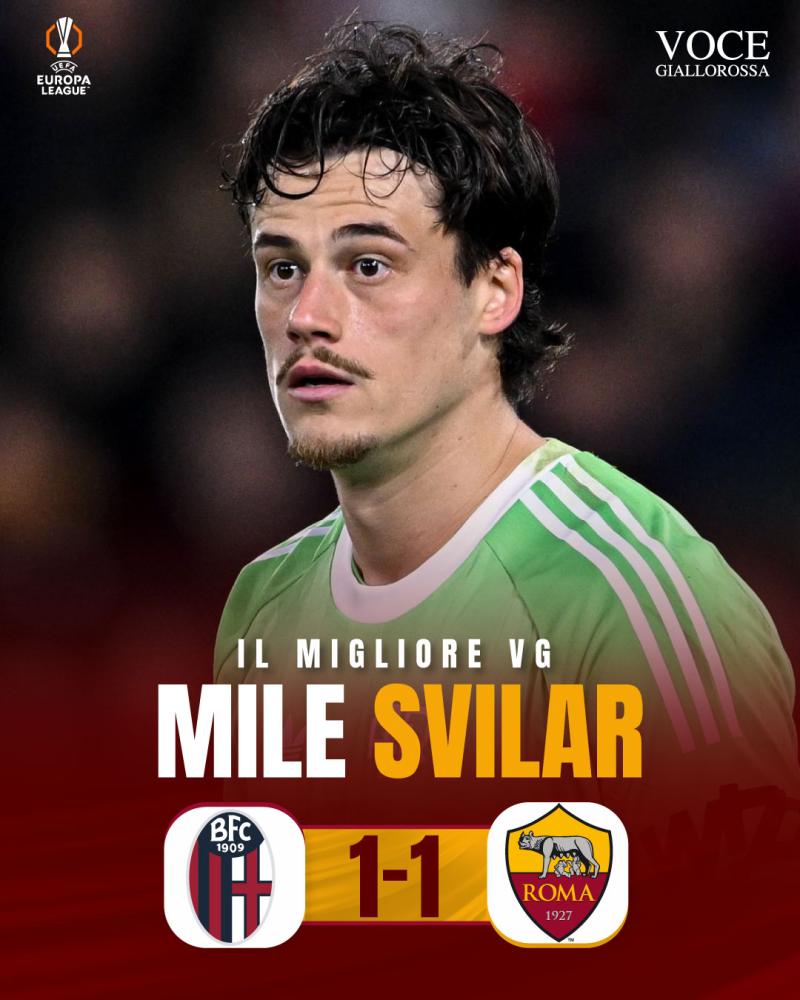 La Roma, in emergenza, pareggia 1-1 a Bologna e giovedì, in casa, si giocherà l'accesso ai quarti di finale di Europa League. Il gol del pareggio lo ha realizzato Pellegrini, ma la differenza l'hanno fatta ancora Svilar e Malen. Proprio Il portiere, dopo un testa a testa con l'olandese, è stato stato nominato #IlMiglioreVG dai nostri lettori attraverso le votazioni avvenute sui canali social di Vocegiallorossa.it. Per Svilar, si tratta del nono riconoscimento stagionale.