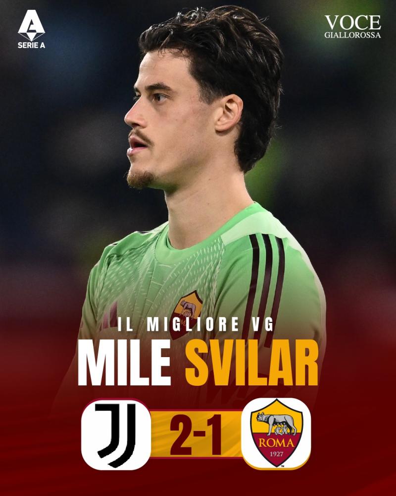 La Roma è uscita sconfitta dal match di sabato sera contro la Juventus per 2-1. Protagonista in campo con le sue parate è stato Mile Svilar, capace di tenere a galla i giallorossi durante il match grazie ai suoi interventi. L'estremo difensore giallorossi è stato così eletto #IlMiglioreVG del match attraverso i canali social di Vocegiallorossa.it: X, Instagram, Facebook e Threads. Per Svilar si tratta del settimo riconoscimento stagionale.