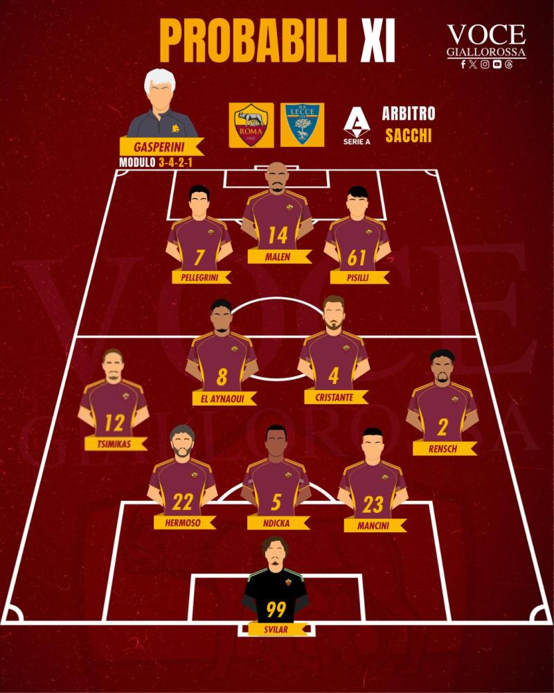 ROMA (3-4-2-1): Svilar; Mancini, Ndicka, Hermoso; Rensch, Cristante, El Aynaoui, Tsimikas; Pisilli, Pellegrini; Malen.
