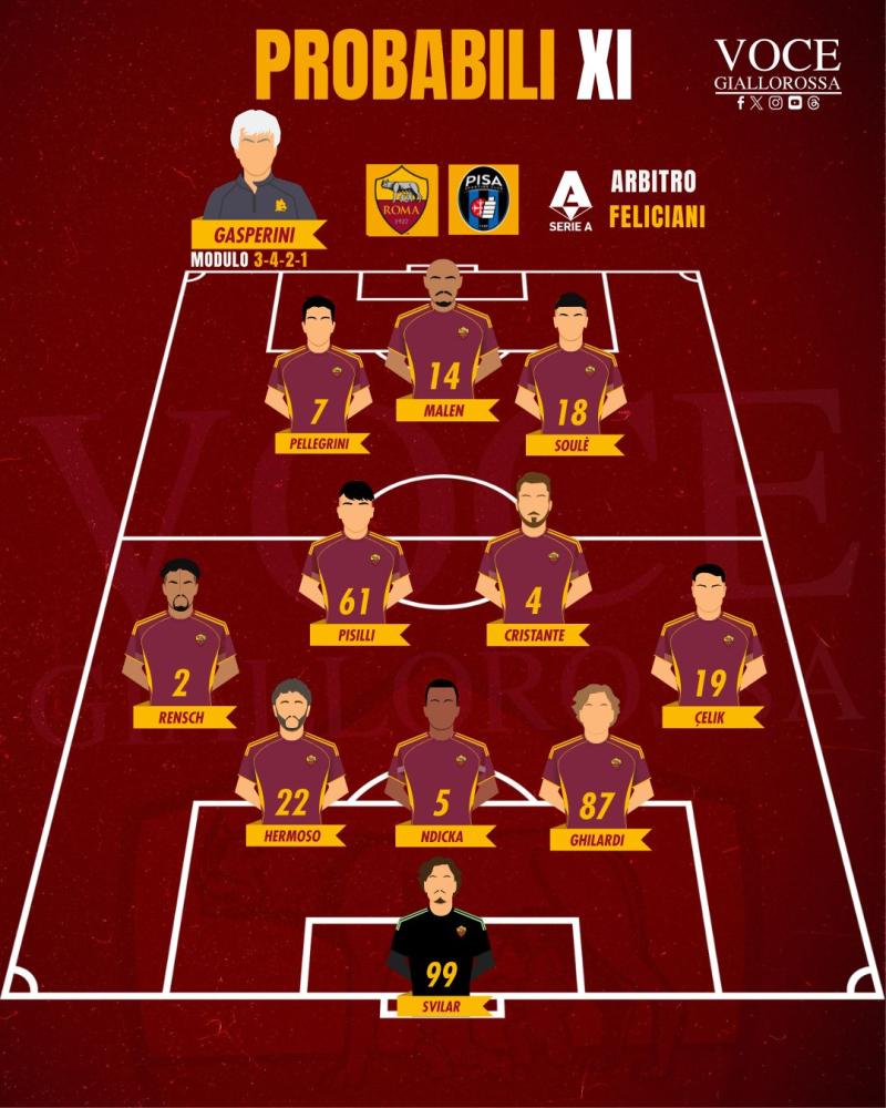 ROMA (3-4-2-1): Svilar; Ghilardi, Ndicka, Hermoso; Celik, Cristante, Pisilli, Rensch; Soulé, Pellegrini; Malen.