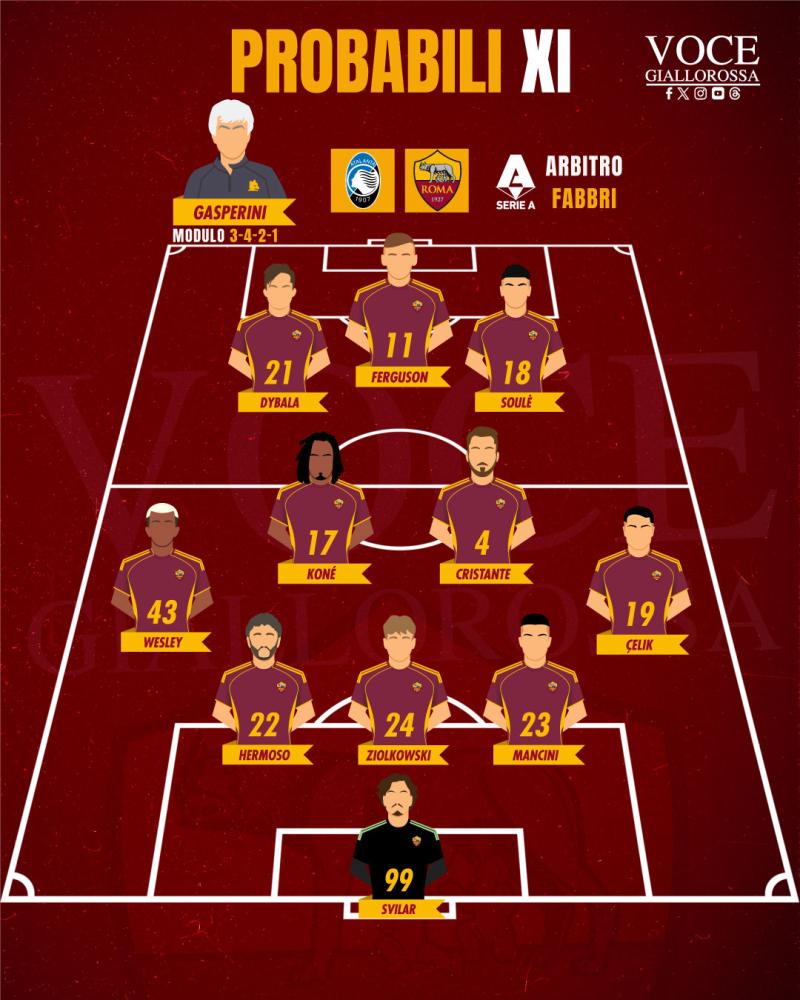 ROMA (3-4-2-1): Svilar; Mancini, Ziolkowski, Hermoso; Celik, Cristante, Koné, Wesley; Soulé, Dybala; Ferguson.