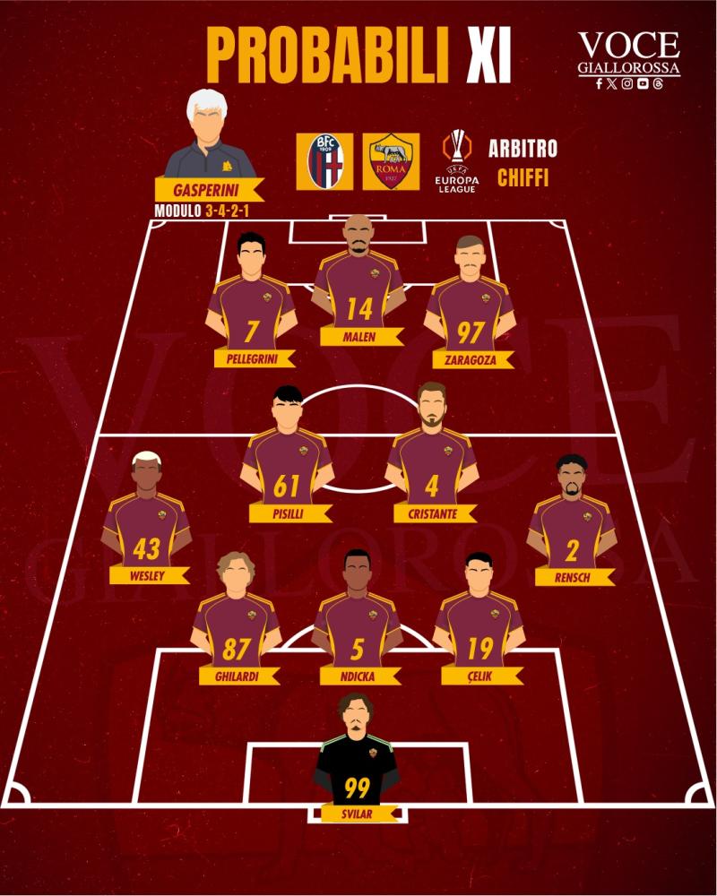 ROMA (3-4-2-1): Svilar; Celik, Ndicka, Ghilardi; Rensch, Cristante, Pisilli, Wesley; Zaragoza, Pellegrini; Malen.