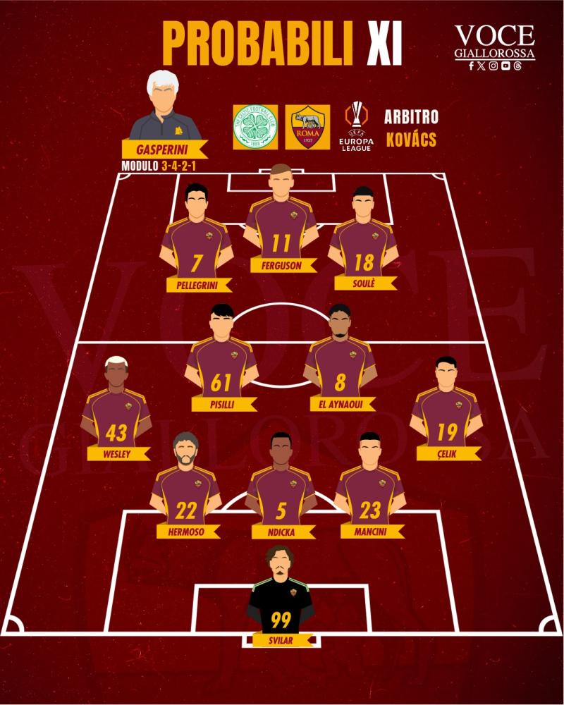 ROMA (3-4-2-1): Svilar; Mancini, Ndicka, Hermoso; Celik, El Aynaoui, Pisilli, Wesley; Soulé, Pellegrini; Ferguson.