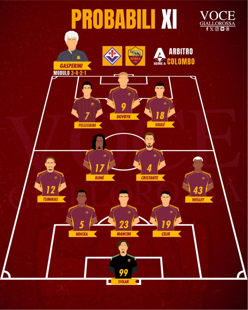 ROMA (3-4-2-1): Svilar; Celik, Mancini, Ndicka; Wesley, Cristante, Koné, Tsimikas; Soulé, Pellegrini; Dovbyk
