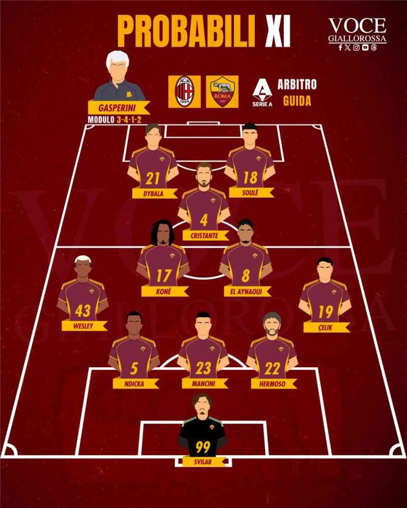 ROMA (3-4-1-2): Svilar; Mancini, Ndicka, Hermoso; Celik, El Aynaoui, Koné, Wesley; Cristante; Soulé, Dybala.