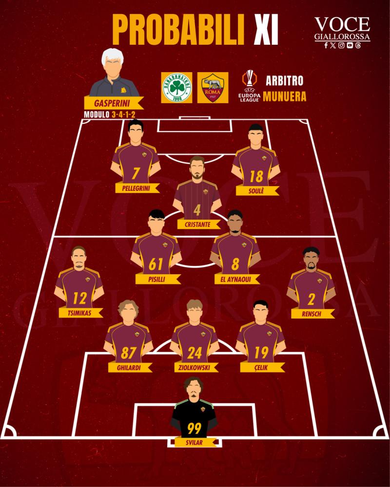 ROMA (3-4-1-2): Svilar; Celik, Ziolkowski, Ghilardi; Rensch, El Aynaoui, Pisilli, Tsimikas; Cristante; Soulé, Pellegrini.