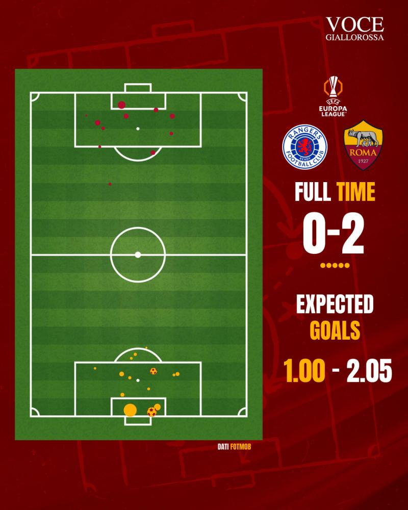 Negli ultimi anni è stato sviluppato un nuovo tipo di dato che può aiutare ad analizzare ciò che è successo nelle partite di calcio e il rendimento delle squadre. Si tratta del dato degli Expected Goals, vale a dire un numero che quantifica, in media, i gol che si segnano in una partita dai tiri che si prendono durante la gara. Un numero non indiscutibile, in quanto sono stati sviluppati diversi modelli che danno dei risultati diversi (anche se tendenzialmente simili), e al quale non si può ridurre l’intero andamento di un match, ma che può aiutare a dare contezza di determinate situazioni in modo più freddo. Ecco l’analisi di Rangers-Roma, con i dati di Fotmob.