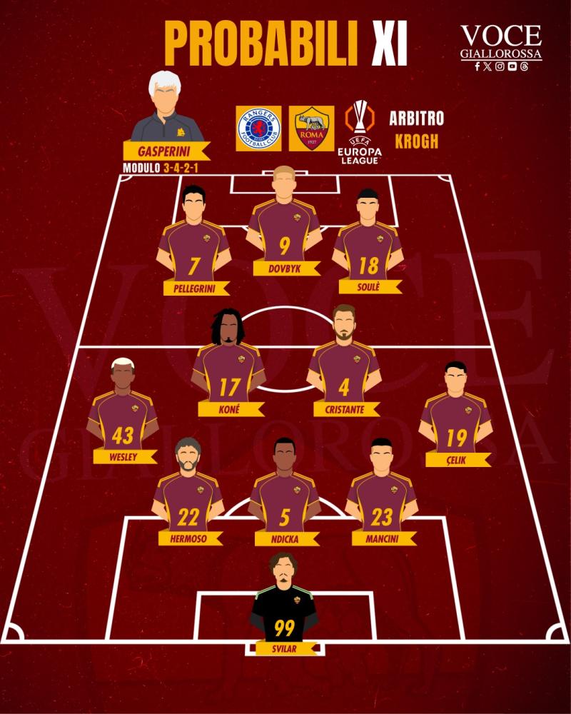 ROMA (3-4-2-1): Svilar; Mancini, Ndicka, Hermoso; Celik, Cristante, Koné, Wesley; Soulé, Pellegrini; Dovbyk.