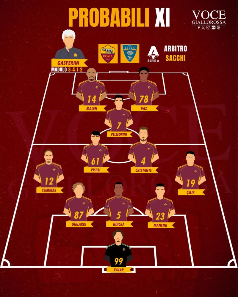 ROMA (3-4-1-2): Svilar; Mancini, Ndicka, Ghilardi; Celik, Cristante, Pisilli, Tsimikas; Pellegrini; Vaz, Malen.