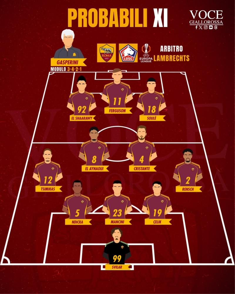 ROMA (3-4-2-1): Svilar, Celik, Mancini, Ndicka; Rensch, Cristante, El Aynaoui, Tsimikas; Soulé, El Shaarawy; Ferguson.