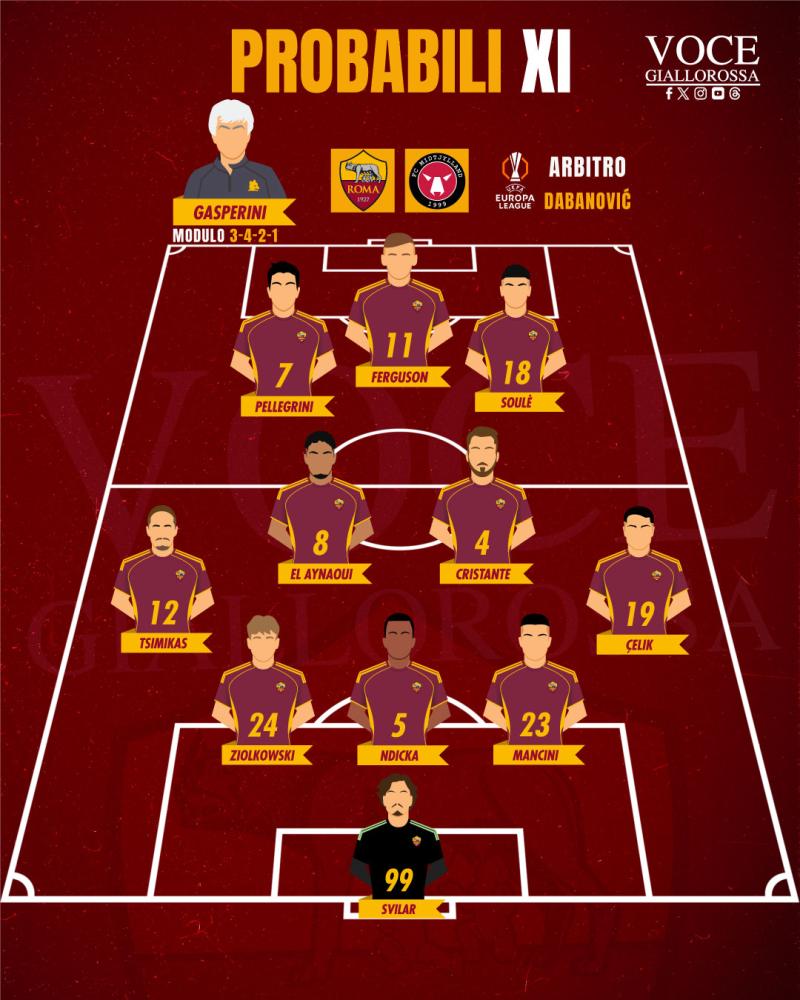 ROMA (3-4-2-1): Svilar; Mancini, Ndicka, Ziolkowski; Celik, Cristante, El Aynaoui, Tsimikas; Soulé, Pellegrini; Ferguson