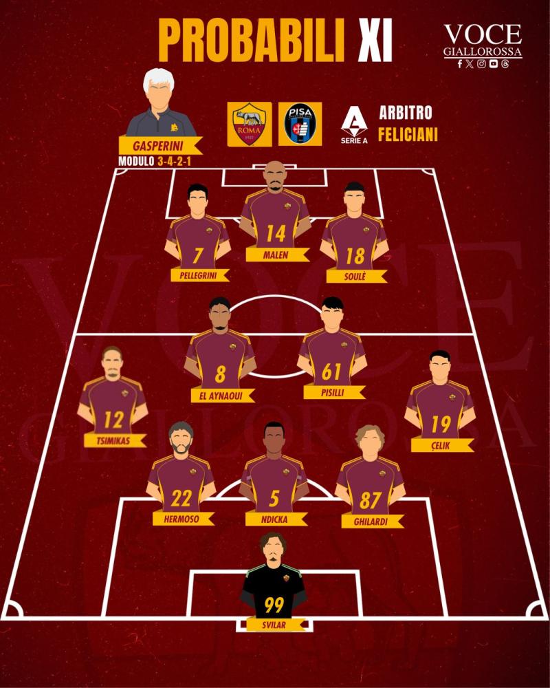 LE PROBABILI FORMAZIONI DI ROMA-PISA: LE SCELTE DI GASPERINI - Dopo il match di San Siro, il tecnico di Grugliasco deve fare a meno dell'infortunato Mancini: pronto Ghilardi al suo posto, che insieme a Ndicka ed Hermoso comporrà la linea difensiva davanti a Svilar. Sulle corsie esterne dovrebbero avere spazio Celik e Tsimikas, con Rensch pronto a insidiare il greco. A centrocampo, complice l’assenza di Koné, spazio ancora a Pisilli, ma occhio alle chance di El Aynaoui, in vantaggio su Cristante. In avanti, infine, conferma per Soulé e Pellegrini alle spalle di Malen.