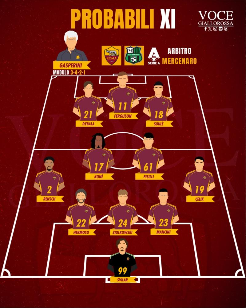 ROMA (3-4-2-1): Svilar; Mancini, Ziolkowski, Hermoso; Celik, Pisilli, Koné, Rensch; Soulé, Dybala; Ferguson.