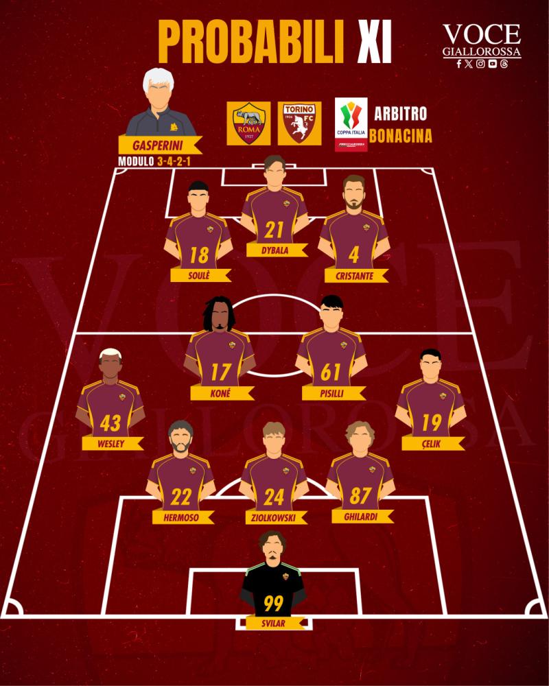 ROMA (3-4-2-1): Svilar; Ghilardi, Ziolkowski, Hermoso; Celik, Pisilli, Koné, Wesley; Cristante, Soulé; Dybala.