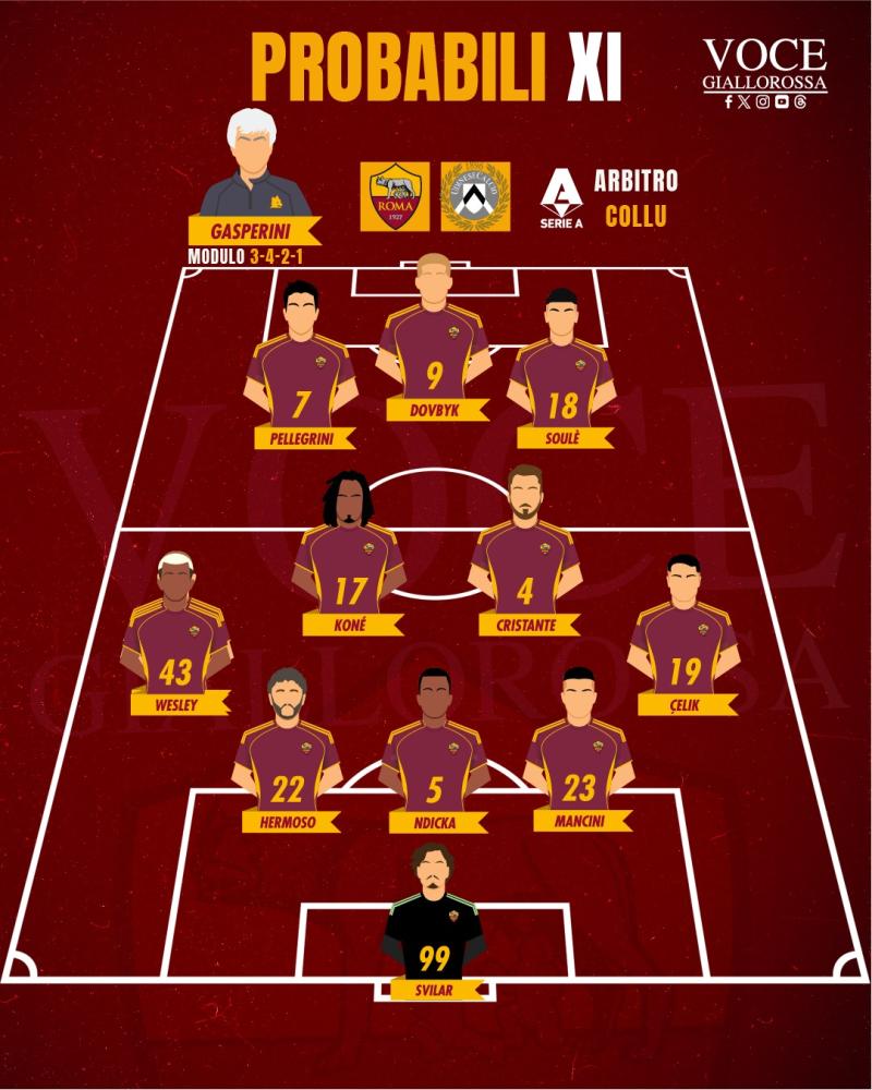 ROMA (3-4-2-1): Svilar; Mancini, Ndicka, Hermoso; Celik, Cristante, Koné, Wesley; Soulé, Pellegrini; Dovbyk.