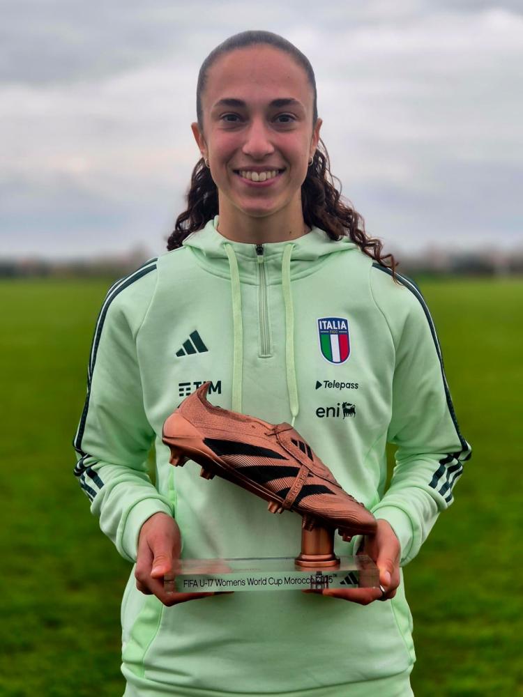 Uno straordinario riconoscimento, per un Mondiale che ne ha esaltato il grande talento e le qualità. Giulia Galli, attaccante classe 2008 della Roma e della Nazionale, è stata premiata oggi con lo scarpino di bronzo FIFA per il terzo posto nella classifica marcatrici del Mondiale Under 17 che si è giocato nell’ottobre scorso in Marocco: per Galli, già protagonista nelle Isole Faroe durante l’Europeo di maggio, cinque gol e un assist. Prima la doppietta alla Costa Rica, poi quella alle padrone di casa del Marocco, infine una rete nel 4-3 al Brasile, in un Mondiale che per l’Italia si è concluso con la sfortunata eliminazione ai rigori nei quarti contro il Messico.