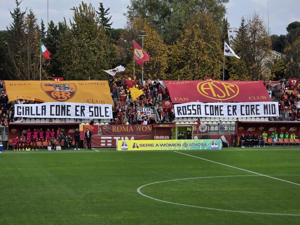 La Roma Femminile di Luca Rossettini è scesa in campo alle 15:30 per il derby contro la Lazio, uno degli appuntamenti più attesi della stagione. All’ingresso delle giallorosse sul terreno di gioco, i sostenitori hanno infatti esposto uno striscione riportando la frase: «gialla come er sole rissa come er core mio». Un messaggio semplice ma fortemente identitario, che richiama il legame profondo tra la città, i suoi colori e la passione di chi segue la squadra femminile in ogni occasione.